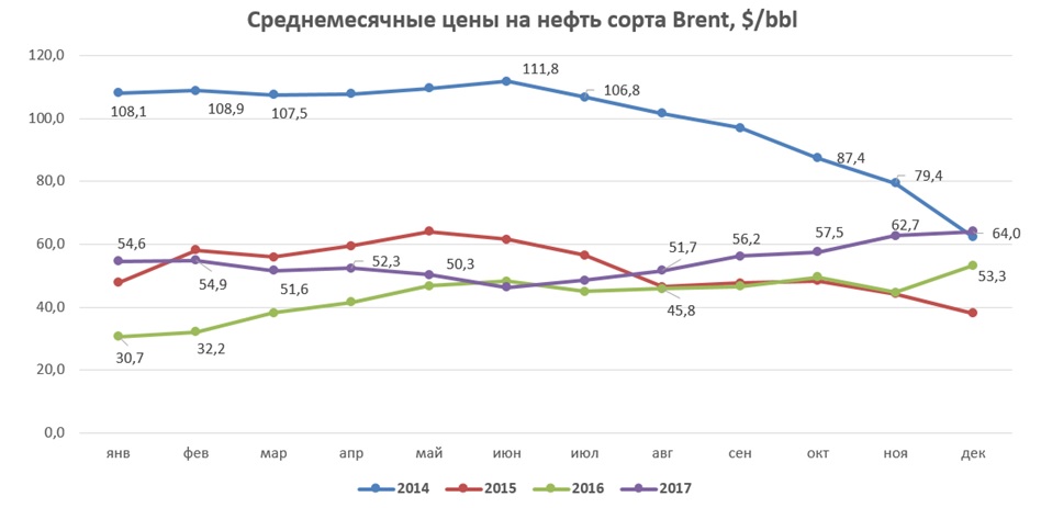 Еще одна относительность: рост в 2017 году и в процентном, и в денежном выражении оказался хуже 2016 года. В 2016 году среднемесячные цены выросли с $30,7 до $53,3 (+$22,6), тогда как в 2017 году прирост среднемесячных цен с начала года составил лишь $10. Темпы восстановления цен явно замедлились, это свидетельствует о том, что 2018 год обрадовать схожим ростом вряд ли сможет.