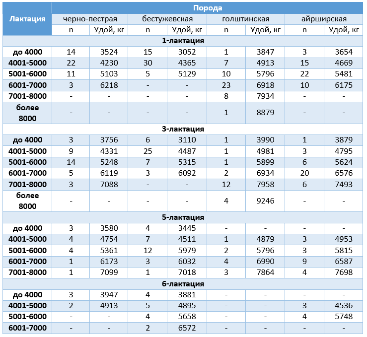 В группе коров с удоем до 4000 кг молока зарегистрировано 28% животных черно-пестрой породы, 30% – бестужевской, 2% – голштинской и 6% айрширской породы. Продуктивность более 5000 кг молока имели соответственно по группам 28, 10, 84, 64% коров, более 6000 кг – 6, 0, 64, 20%. Продуктивность более 7000 кг молока за первую лактацию отмечена только у 18% коров голштинской породы.