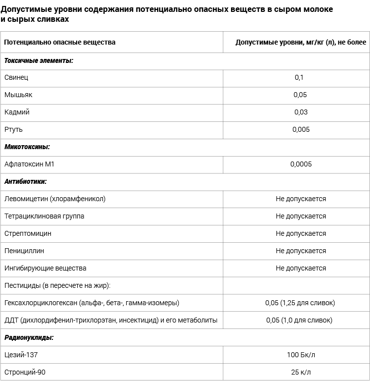 Показатели химической и радиологической безопасности коровьего сырого молока и сырых сливок не должны превышать установленный федеральным законом допустимый уровень (табл. 4).