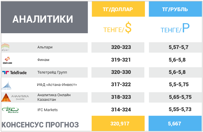 По курсу тенге к доллару мы меняем прогноз до 320-323 тенге за доллар, а по курсу тенге к рублю – до 5,57-5,7 тенге за рубль.