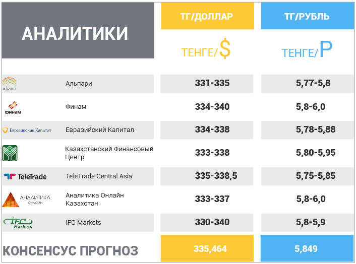 По курсу тенге к доллару мы сохраняем прогноз в 331-335 тенге за доллар и по курсу тенге к рублю оставляем неизменным прогноз на уровне 5,77-5,8 тенге за рубль.