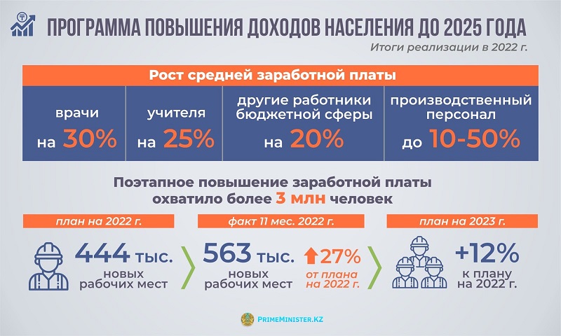 Вместе с тем Алихан Смаилов подчеркнул, что в настоящее время продолжается реализация программы по повышению доходов населения до 2025 года. В рамках нее 3 млн человек уже была повышена зарплата, в том числе врачам на 30%, учителям – на 25%, другим работникам бюджетной сферы – на 20%, производственному персоналу – на 10-50%.