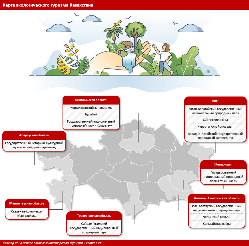 География экотуризма в Казахстане постоянно расширяется. В Алматинском регионе популярностью пользуются Иле-Алатауский национальный парк, Кольсайские озёра и Чарынский каньон. В Восточном Казахстане туристов привлекает Катон-Карагай с его природными богатствами, пантовыми хозяйствами и радоновыми источниками. В Акмолинской области Бурабай становится круглогодичным направлением отдыха, а в Мангистау - востребованы джип-туры и маршруты по уникальным скальным ландшафтам. В целом практически каждый регион страны сегодня предлагает свои уникальные природные локации для экотуристов.