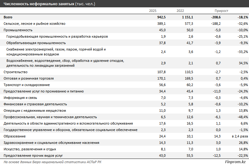В разрезе категорий более 42% неформально занятых - это самозанятые, что составляет 397,6 тыс. человек. Чаще всего речь идет о людях, занятых в личных подсобных хозяйствах или оказывающих услуги без официальной регистрации. Ещё 544,9 тыс. казахстанцев работают по найму, но остаются вне формального сектора. Причинами могут быть устные договорённости, отсутствие социальных и пенсионных отчислений со стороны работодателя или работа по гражданско-правовым договорам на одного заказчика. При этом численность последней категории за три года сократилась более чем в два раза - до 15,9 тыс. человек.