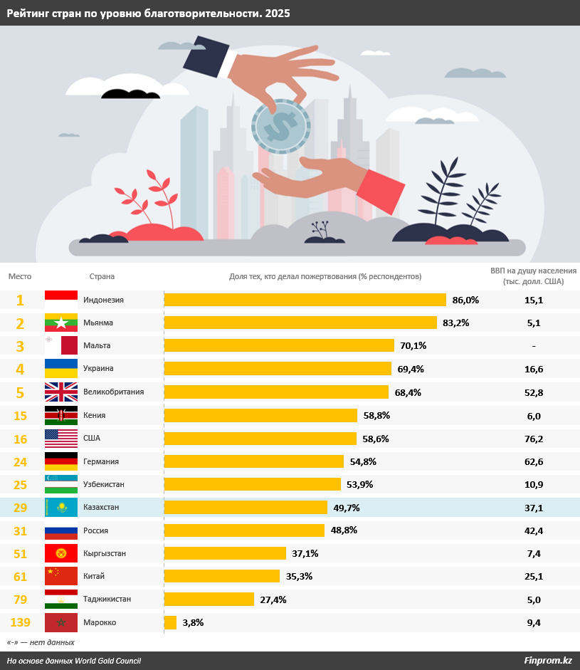 В 2025 году Казахстан оказался на 29-й позиции в мировом рейтинге благотворительности. Исследование показало, что 49,7% опрошенных в стране за последний месяц жертвовали деньги или передавали материальные ценности на благие цели, передает inbusiness.kz со ссылкой на finprom.kz.