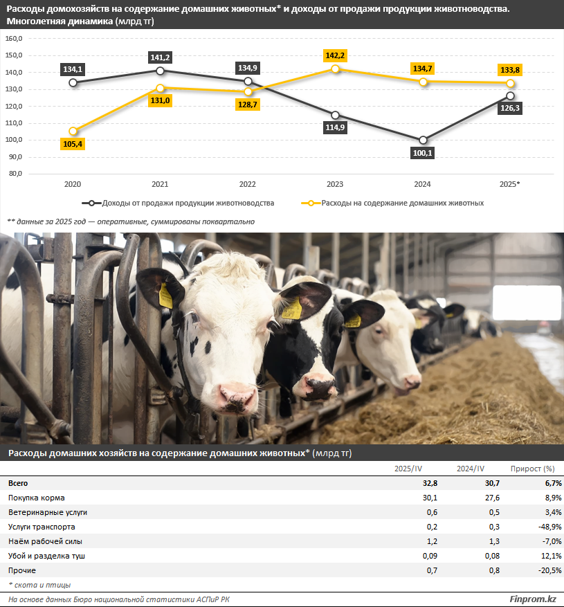 Такая же ситуация наблюдалась и в конце 2025 года: расходы домохозяйств достигли 32,8 млрд тенге, увеличившись на 6,7% и превысив доходы. Основной причиной роста затрат стало подорожание кормов, расходы на которые увеличились на 8,9%.