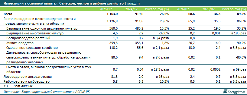 При этом уже в начале 2026 года наблюдается значительное оживление инвестиционной активности: за январь-февраль вложения в эти направления выросли почти в два раза по сравнению с аналогичным периодом прошлого года. Существенный рост показало и смешанное сельское хозяйство: в 2,1 раза по итогам 2025 года и в 5,5 раза - за первые два месяца текущего года.