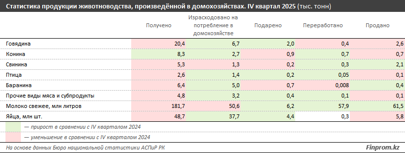 Данные бюро национальной статистики позволяют лишь частично оценить, как сельские домохозяйства распределяют произведённую продукцию. Так, в четвёртом квартале 2025 года только 32,7% говядины было использовано для собственного потребления. На продажу направили 12,8%, около 10% передали родственникам и знакомым, и лишь 1,8% переработали. Схожая картина наблюдается и по конине. При этом статистика отражает лишь общие тенденции, поскольку учитывает ограниченное число направлений использования и не исключает реализацию продукции, произведённой ранее.