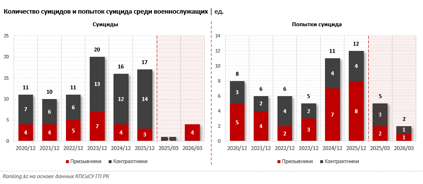 С 2020 года в казахстанской армии зафиксировано 89 случаев суицида среди военнослужащих. Только за первые месяцы текущего года погибли четверо призывников, передает inbusiness.kz со ссылкой на ranking.kz.