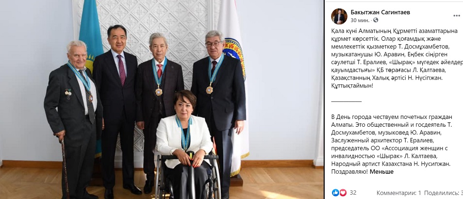 "Звания "Почетный гражданин города" удостоены: общественный и госдеятель Темирхан Досмухамбетов, известный музыковед профессор, член Союза композиторов Республики Казахстан и Союза музыкальных деятелей Республики Казахстан Юрий Петрович Аравин; академик, заслуженный архитектор Казахской ССР, член Союза архитекторов Казахстана Тохтар Ералиев; председатель ОО "Ассоциация женщин с инвалидностью "Шырак", член Координационного совета по вопросам инвалидов при акиме города Ляззат Калтаева; Народный артист Республики Казахстан Нургали Нусипжан", - сообщил он на своей странице в FB.