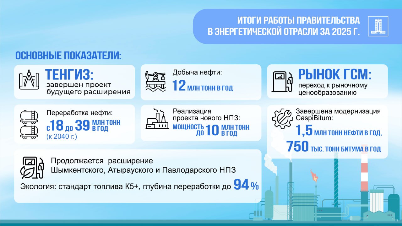 В 2025 году продолжалась реализация масштабных реформ, инициированных президентом страны. Одним из ключевых событий стало полное завершение проекта расширения на месторождении Тенгиз. Ввод в эксплуатацию завода третьего поколения обеспечил прирост добычи нефти на 12 млн тонн в год.