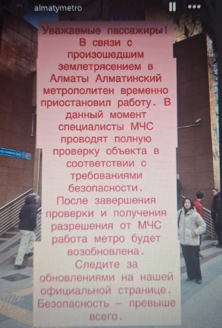 "В связи с произошедшим землетрясением метрополитен в Алматы временно приостановил работу. В данный момент специалисты МЧС проводят полную проверку объекта в соответствии с требованиями безопасности. После завершения проверки и получения разрешения от МЧС работа метро будет возобновлена. Следите за обновлениями на нашей странице", – сказано в сообщении.