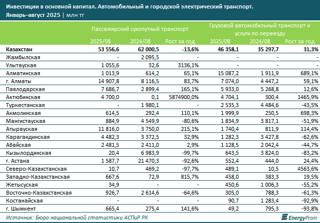 Инвестиции в основной капитал в сфере автомобильного и городского электрического транспорта по итогам января–августа 2025 года составили 53,6 млрд тг — на 13,6% меньше в стоимостном выражении, чем годом ранее. В том числе инвестиции в сферу автобусных перевозок составили 41,8 млрд тг, в сектор перевозок метрополитеном — 10,2 млрд тг, трамваями — 257,4 млн тг, такси — 84 млн тг., передает inbusiness.kz со ссылкой на Еnergyprom.kz.