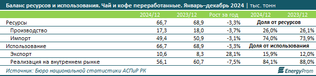"В результате по итогам января–декабря прошлого года местные компании обеспечили 26% спроса на переработанный чай и кофе (включая реализацию на внутреннем рынке и экспорт), что практически соответствует показателю годом ранее (26,1%). Объём реализации на внутреннем рынке по итогам января–декабря составил 56,1 тыс. тонн — на 7,5% меньше, чем годом ранее", - пишет Еnergyprom.kz.