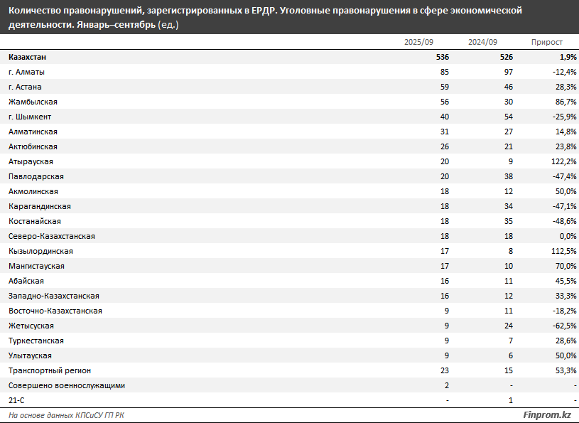 "Далее расположились Астана (59 случаев, плюс 28,3%), Жамбылская область (56 случаев, плюс 86,7%), Шымкент (40 случаев, минус 25,9%) и Алматинская область (31 случай, плюс 14,8%). Меньше всего уголовных правонарушений в сфере экономической деятельности было зарегистрировано в Улытауской, Туркестанской, Жетысуской и Восточно-Казахстанской областях: по 9 случаев в каждом из регионов", - говорится в исследовании.