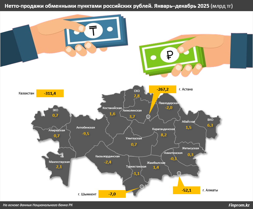 Процесс избавления от рублей был сосредоточен в двух крупнейших городах страны — Астане (минус 267,2 млрд тг) и Алматы (минус 52,1 млрд тг).