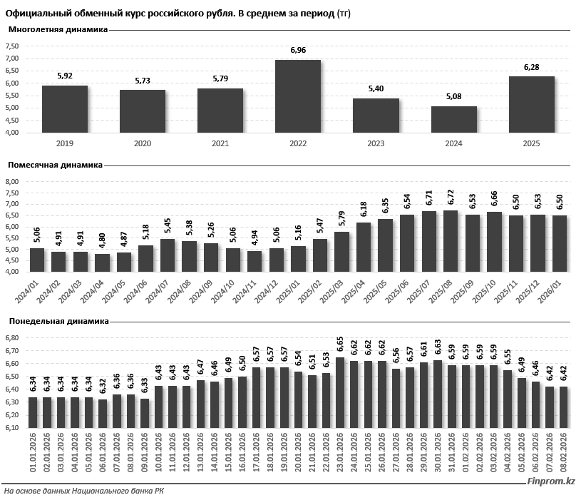В течение 2025 года среднемесячный курс рубля варьировался от 5,16 тг в январе до 6,72 тг в августе. К декабрю курс снизился до 6,53 тг, а в январе текущего года — до 6,5 тг, что, впрочем, на 26% выше, чем в январе 2025-го. В конце января — начале февраля текущего года курс рубля составлял 6,56 тг, а к 8 февраля он опустился до 6,43 тг.
