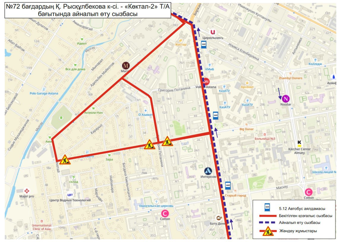 Временно изменена схема движения маршрута № 72, передает inbusiness.kz со ссылкой на ТОО "City Transportation Systems".