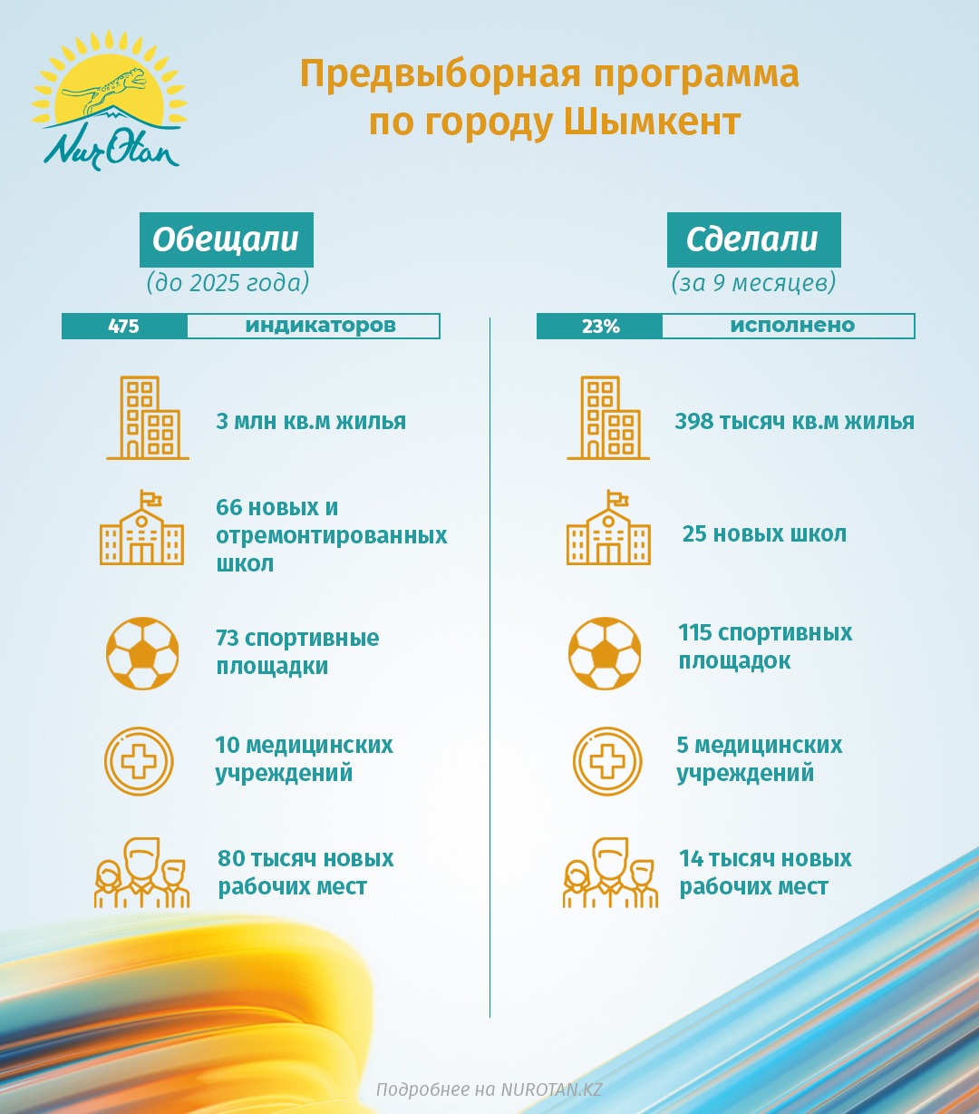 По информации председателя филиала, акима Шымкента Мурата Айтенова, за 9 месяцев исполнено 23% из 475 индикаторов, запланированных до 2025 года. В городе уже построено 398 тысяч кв. м жилья, 5 медицинских учреждений и 115 спортивных площадок. Построена электроподстанция "Бозарык" в целях бесперебойной подачи электроэнергии для 250 тысяч человек. Завершается строительство газораспределительной станции, что обеспечит природным газом 5 отдаленных населенных пунктов. Создано свыше 14 тысяч новых рабочих мест.