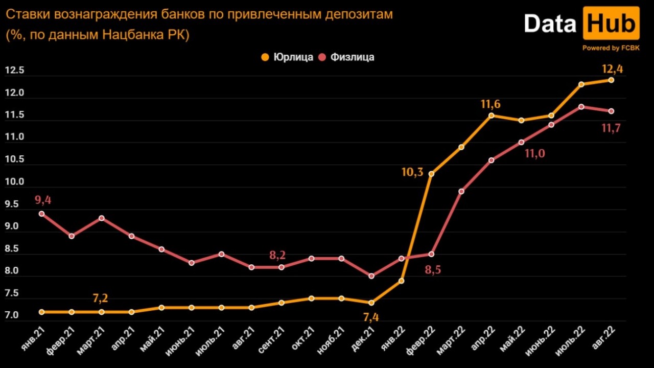 Что касается юридических лиц, то тут рост продолжается. В августе средняя ставка вознаграждения по привлеченному вкладу составила 12,4%, что на 0,1 п.п. больше, чем в июле.