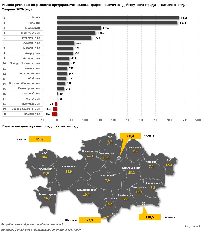 "Городом, где за год появилось больше всего новичков в бизнесе (плюс 4,3 тыс.), стала Астана. Общее количество компаний в главном мегаполисе страны к 1 марта 2026 года превысило 80,4 тыс. Предпринимательской столицей по праву можно назвать Алматы, где к 1 марта насчитывалось около 118,5 тыс. действующих предприятий (плюс 4,3 тыс. за год). Шымкент, занявший третью строчку рейтинга, на самом деле сильно отстал от обеих столиц, в этом южном мегаполисе работали всего около 24,9 тыс. компаний (плюс 1,6 тыс. за год). В пятёрку лидеров по приросту количества действующих юрлиц также вошли Мангистауская (плюс 1,4 тыс.) и Туркестанская (плюс 1,2 тыс.) области", - говорится в исследовании.