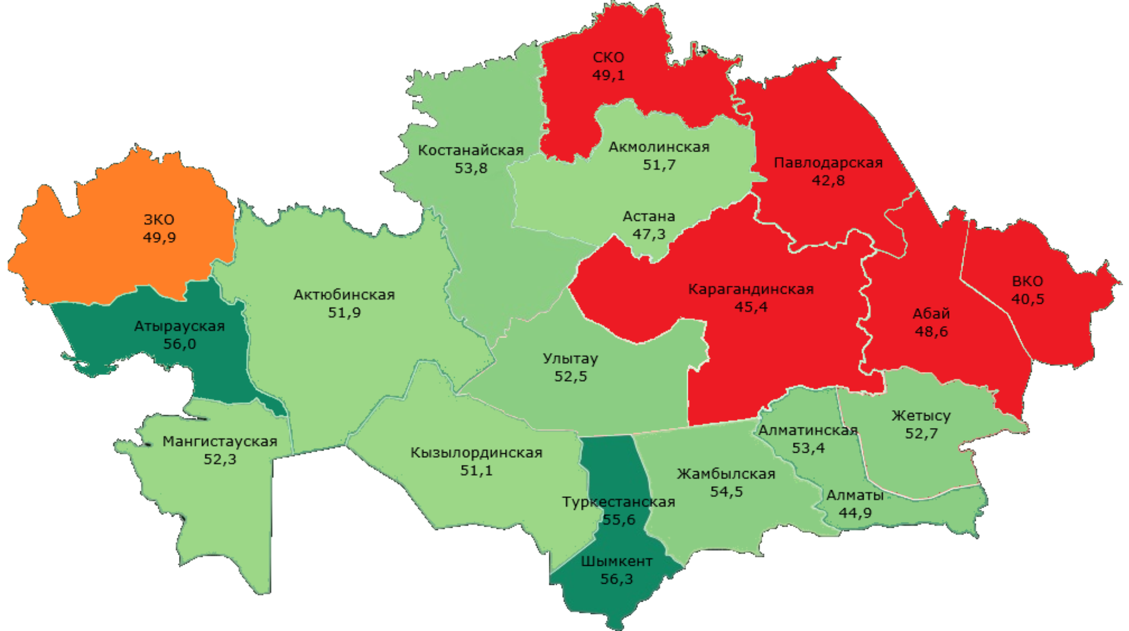 Наиболее высокие значения индекса были зафиксированы в Атырауской (56,0), Туркестанской (55,6) областях и городе Шымкенте (56,3), тогда как наименьшие — в Восточно-Казахстанской (40,5) и Павлодарской (42,8) областях. Расширение деловой активности наблюдалось в сельском хозяйстве (52,6) и предоставлении услуг по проживанию и питанию (50,5), а также промышленности: горнодобывающей (50,6) и обрабатывающей (51,1). В зоне снижения находились строительство (49,5) и торговля (47,8).