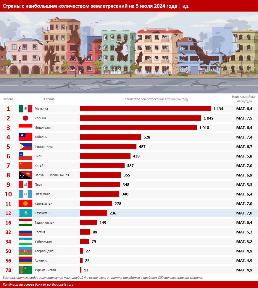Если же говорить в целом про мир, на 5 июля текущего года сомнительным лидером по числу землетрясений, произошедших с начала года, является Мексика. В пятёрке "самых тряских" стран оказались Япония, Индонезия, Тайвань и Филиппины. Казахстану присвоили 12-е место с 236 землетрясениями.