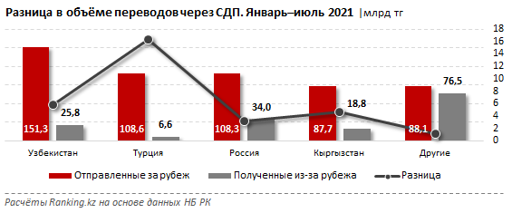Наибольший объем отправленных из РК через СДП средств был направлен в Узбекистан (151,3 млрд тг), Турцию (108,6 млрд тг), Россию (108,3 млрд тг) и Кыргызстан (87,7 млрд тг).