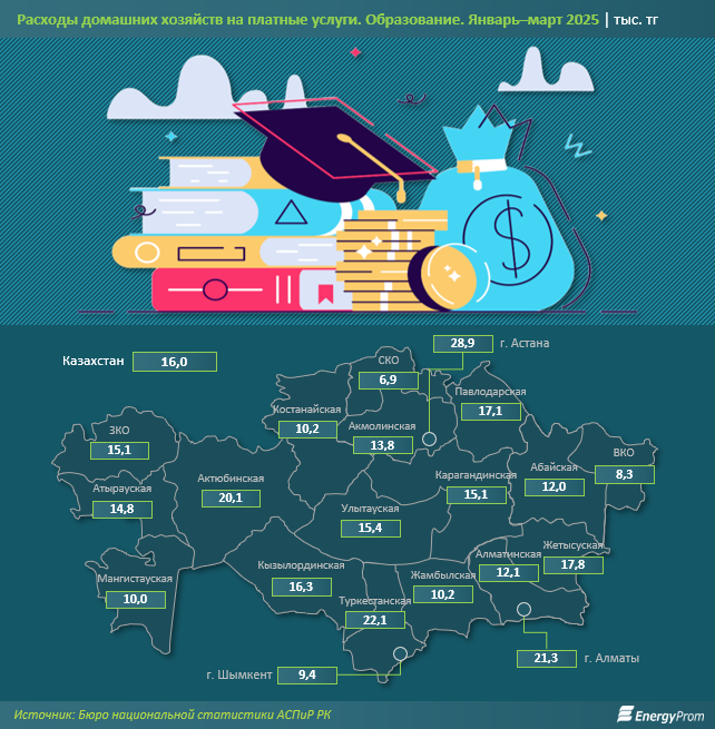"В региональном разрезе больше всех на образование потратили жители Астаны: 28,9 тыс. тг, против 31,1 тыс. тг годом ранее (минус 6,9%). На втором и третьем местах оказались Туркестанская область (22,1 тыс. тг, против 9,1 тыс. тг годом ранее, рост — в 2,4 раза) и Алматы (21,3 тыс. тг, плюс 4,9%). Меньше всех на услуги образования потратили жители Северо-Казахстанской и Восточно-Казахстанской областей, а также Шымкента", - говорится в исследовании.