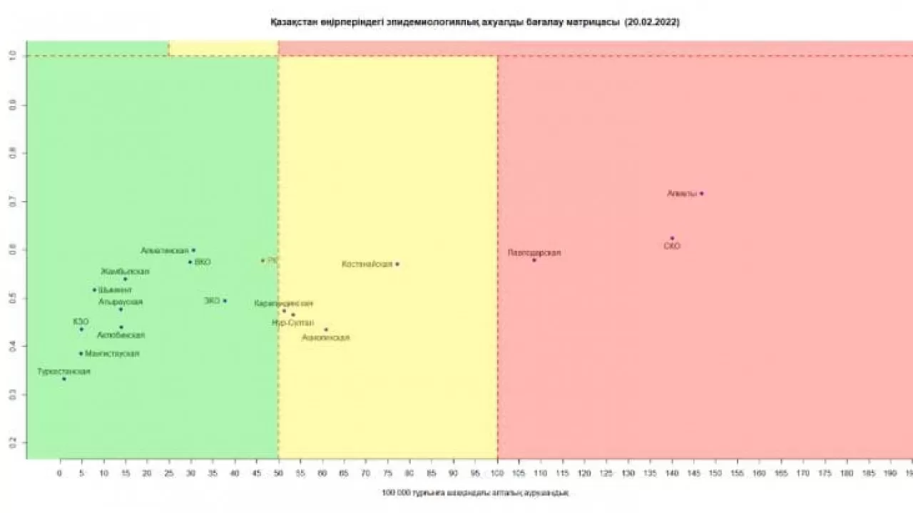 В "красной" зоне: город Алматы, Павлодарская и Северо-Казахстанская области.