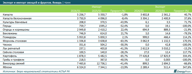 По данным Еnergyprom.kz, за год потребление фруктов выросло на 2,8%, до 82,7 кг на человека за 2025-й. Потребление овощей (кроме картофеля) увеличилось на 3,1%, до 83,3 кг, а потребление непосредственно картофеля — лишь на 0,3%, до 45,5 кг на человека.