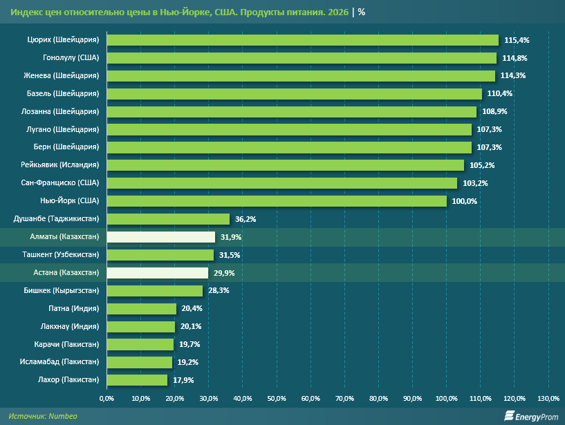 Согласно данным международной базы Numbeo, индекс цен на продукты питания, отражающий относительную стоимость потребительской корзины и принимающий уровень цен в Нью-Йорке за 100%, в городах Центральной Азии варьируется от 28,3% до 36,2%.