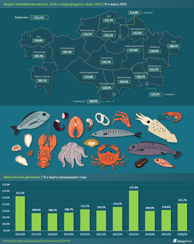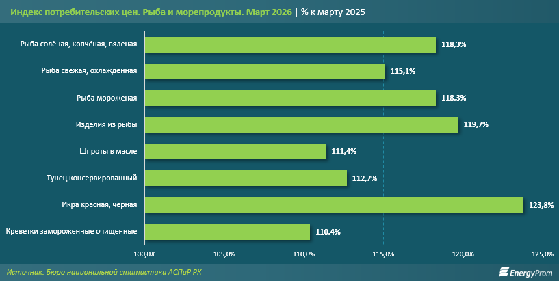 Несмотря на рост производства, потребители сталкиваются с серьёзным давлением на кошельки. В марте 2026-го цены на рыбу и морепродукты в среднем по стране подскочили на 15,7% по сравнению с мартом прошлого года. Это один из наибольших показателей удорожания в секторе за последнее десятилетие, уступающий лишь пиковым значениям марта 2023 года (на 25,4%), передает inbusiness.kz со ссылкой на Еnergyprom.kz.