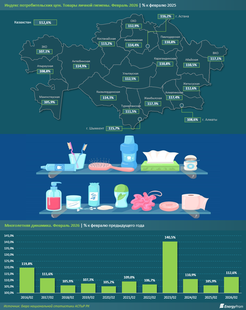 "По итогам февраля 2026 года цены на товары личной гигиены в Казахстане выросли на 12,6% за год. Для сравнения: в аналогичном периоде 2025-го показатель составлял 5,9%, а в феврале 2023 года на фоне геополитической нестабильности и трансформации логистических цепочек был зафиксирован рост цен на 40,5%", - пишет Еnergyprom.kz.