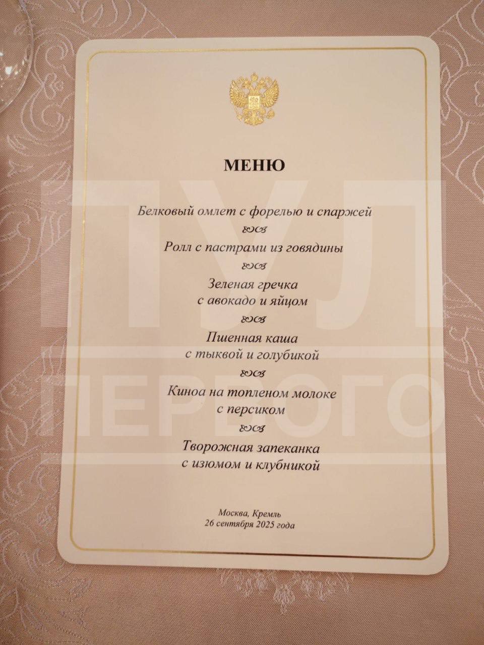 В Кремле на рабочем завтраке президентам России и Беларуси Владимиру Путину и Александру Лукашенко подали изысканные блюда, включающие белковый омлет с форелью и спаржей, ролл с пастрами из говядины, зеленую гречку с авокадо и яйцом, пшенную кашу с тыквой и голубикой, киноа на топленом молоке с персиком и творожную запеканку с изюмом и клубникой, передает inbusiness.kz со ссылкой на Telegram-канал Пул первого.