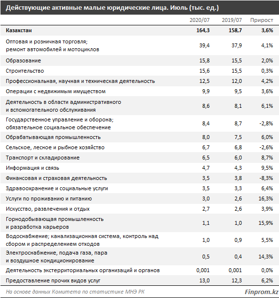 Количество действующих малых компаний в июле достигло 313,6 тыс., рост за год — на 8,8%, что увеличило их долю от зарегистрированных малых компаний с 66,9% до 70,3%. Из них активных малых компаний — 164,3 тыс., рост за год — на 3,6%, при этом их доля от действующих сократилась с 55% до 52,4%.