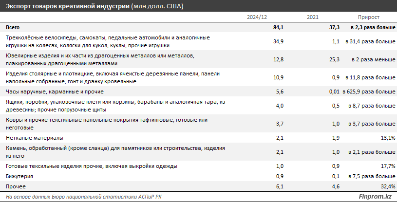 По данным Finprom.kz, наибольшую долю — 41,4% — стоимостного объёма экспорта товаров креативной индустрии заняли трёхколёсные велосипеды, самокаты, различные игрушки на колёсах и куклы.