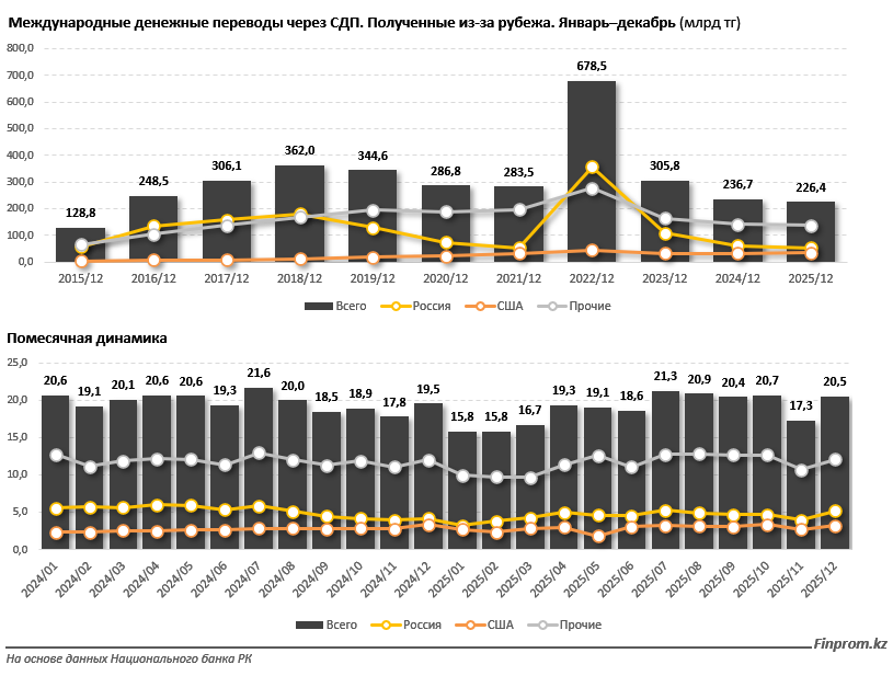 Объём денежных переводов, полученных в Казахстане из-за рубежа через СДП за январь–декабрь 2025 года, составил 226,4 млрд тг — на 4,3% меньше, чем годом ранее. Наблюдается сокращение показателя третий год подряд, передает inbusiness.kz со ссылкой на Finprom.kz.
