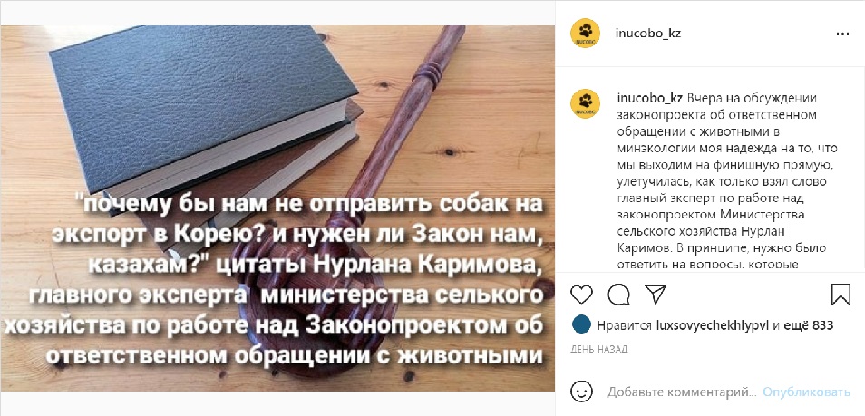"Я даже не поняла, шутит ли он или говорит серьезно. Но, судя по тому, что в конце совещания он спросил: "Вот мы здесь казахи на видеоконференции. Скажите честно, нужен ли нам этот закон вообще?", я поняла, что про Корею он не шутил… Мне стало плохо оттого, что такие люди представляют руководство страны, удостоены чести работать над законопроектом, суть которого не понимают и никогда не поймут. И все это под запись, которую вели в минэнерго", – написала зоозащитник на своей странице.