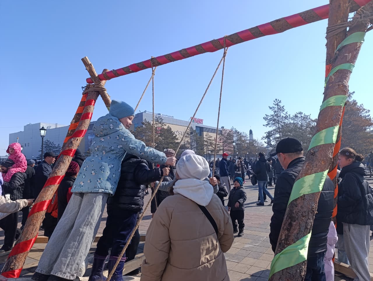 Кстати, в этот раз на площади установили сразу четыре праздничных инсталляции, возле которых гости активно делали селфи или фотографировались семьями. А для любителей алтыбаканов установили порядка 10 таких качелей в разных частях площади. На них весело и шумно качались как дети, так и взрослые.