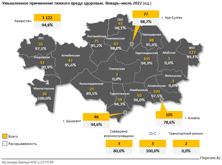 Раскрываемость уголовных правонарушений по умышленному причинению тяжкого вреда здоровью за январь–июль 2022 года составила 94,8%, против 97,8% годом ранее. Самый высокий по РК уровень раскрываемости был отмечен в Мангистауской области: 100%. Следом идут Восточно-Казахстанская область и столица: 99,1% и 98,7% соответственно. Один из самых низких уровней раскрываемости наблюдается в Алматы: 78,6%. При этом отметим, что в трёх новообразованных областях страны не было раскрыто ни одного дела.