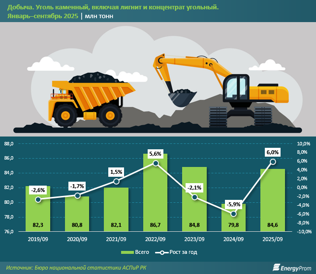 Объём добычи каменного угля, включая лигнит и угольный концентрат, за январь–сентябрь текущего года составил 84,6 млн тонн — на 6% больше, чем за аналогичный период 2024-го. Ранее два года подряд наблюдалось сокращение объёмов добычи: в 2024-м — на 5,9%, в 2023-м — на 2,1%, сообщает inbusiness.kz со ссылкой на Еnergyprom.kz.