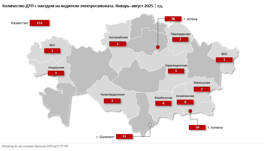 "В регионах такие аварии — большая редкость, единичные случаи. Это связано в первую очередь с разным уровнем распространения услуг кикшеринговых операторов", - пишет Ranking.kz.