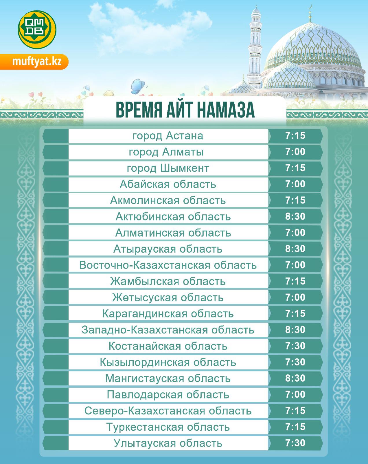 ДУМК опубликовало расписание Айт-намаза по всему Казахстану