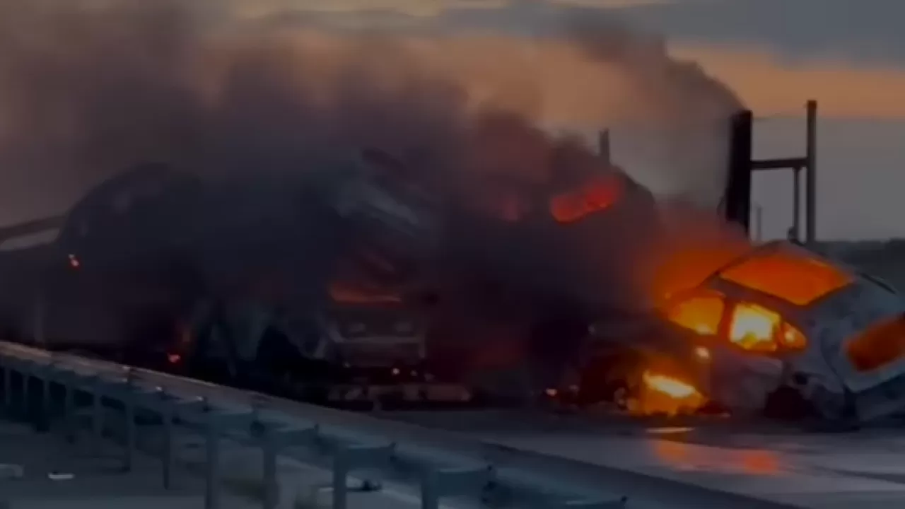 "Грузовой автомобиль, перевозивший восемь легковых машин, столкнулся с другим грузовиком, который перевозил шесть машин. В результате столкновения оба грузовика и находившиеся на них легковые автомобили загорелись", – говорится в сообщении.