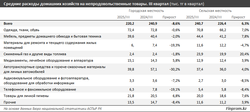 В сельской местности ситуация развивалась несколько иначе. Хотя доля непродовольственных расходов сократилась всего на 0,7 процентного пункта, изменилась сама структура трат. Значительно больше средств сельчане направляли на сжиженный газ: 23,9 тыс. тенге против 2,4 тыс. в городах. Из-за роста потребления и удорожания топлива расходы на баллонный газ увеличились на 20,4%.