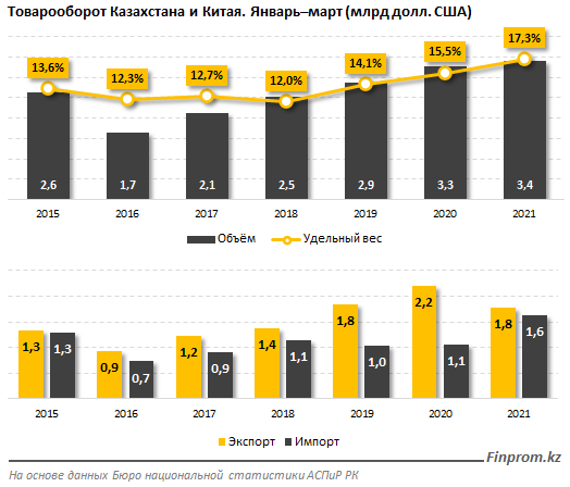 Товарооборот между Казахстаном и Китаем увеличился до 3,4 млрд долл. США за январь-март 2021 года, против 3,3 млрд долл. США в аналогичном периоде годом ранее. Это второй показатель после России (4,8 млрд долл. США), передает inbusiness.kz со ссылкой на finprom.kz.