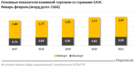Товарооборот с Кыргызстаном за первые два месяца текущего года составил 109,8 млн долл. США — на 8,2% меньше, чем в 2020 году. С Арменией товарооборот за год вырос на 32,2%, но лишь до 2,3 млн долл. США.