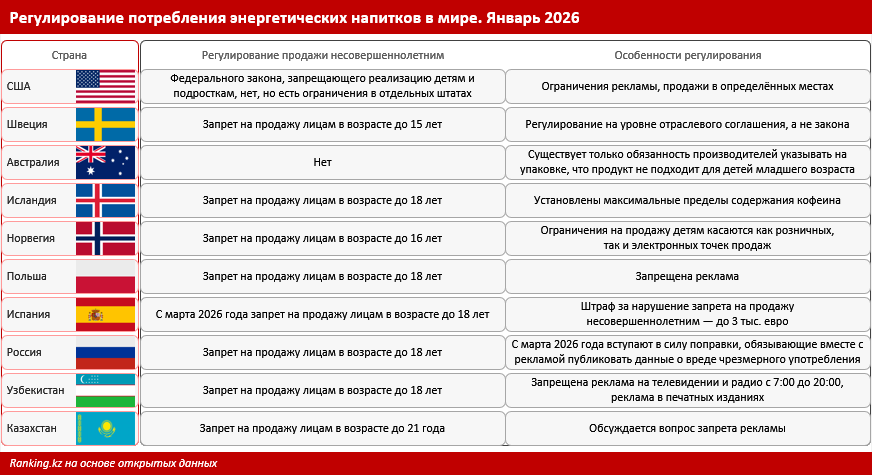 "В этой статье перечислены сразу несколько видов товаров, имеющих ограничения по продаже (табачные изделия, в том числе электронные курительные устройства, энергетические напитки). Поэтому по отчётам ведомства нельзя утверждать, что указанные четыре случая относились именно к продаже энергетиков, а не другой упомянутой продукции", - пишет Ranking.kz.