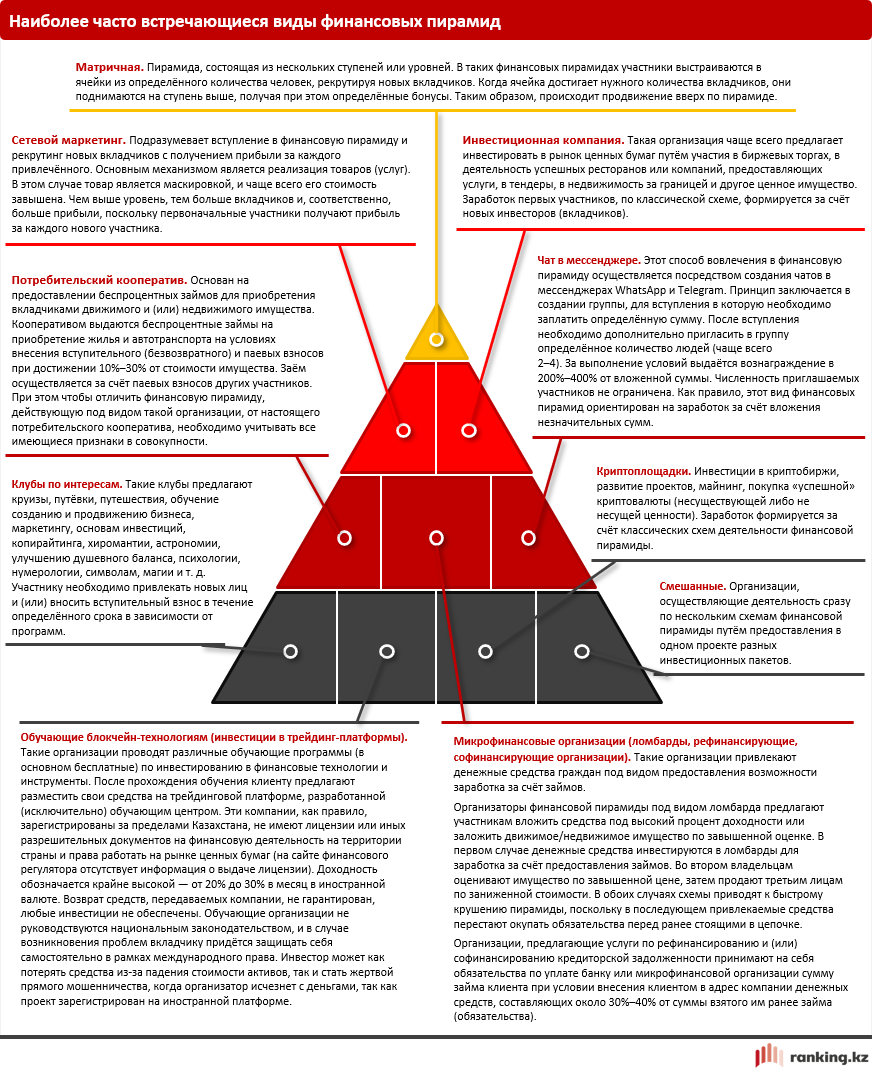 Существуют разные виды финансовых пирамид, в том числе действующие в Казахстане. Причины, по которым люди попадаются на их уловки, остаются прежними: желание быстрой прибыли, недостаток финансовой грамотности и психологическое давление.